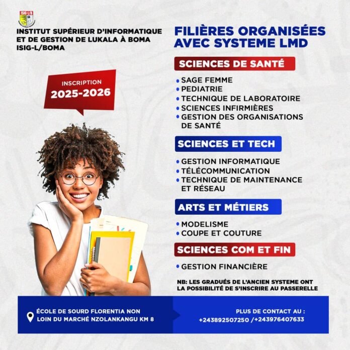 À Boma, l’Institut Supérieur de l’Informatique et des Gestions de Lukula à Boma L/B lance les inscriptions pour l’année académique 2025-2026. Située dans la ville de Boma en l’enceinte de l’école de Sourds de Florentia non loin du marché Zola Nkangu au Kongo central, l’Institut Supérieur de l’Informatique et des Gestions de Lukula à Boma « ISIG L/B », leader en informatique et en gestion agréé par l’Arrêté Ministériel n°125/MINESU/CABMIN/TTL/CMK/JMB/2020 du 12 août 2020 lance les inscriptions des nouveaux étudiants pour l’année académique 2025-2026 dans les facultés suivantes :