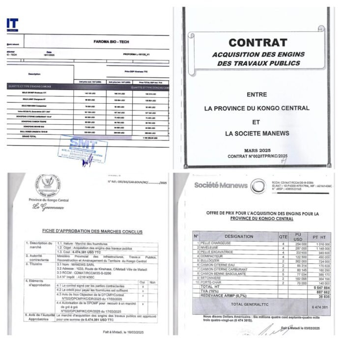 Des informations faisant état d’un présumé détournement de fonds alloués à l’acquisition d’une part des véhicules automobiles destiné aux élus provinciaux du Kongo Central, et des engins de génie civil destiné à la province secouée la le kongo central la semaine dernière. Aujourd’hui, quatres documents financiers liés au contrat signé entre la société MANEWS et le gouverneur de province pour l’acquisition des engins qui servirait à la réhabilitation des routes à desserte agricole dans tous le 10 territoires de la province du Kongo Central font la rage sur les réseaux sociaux.